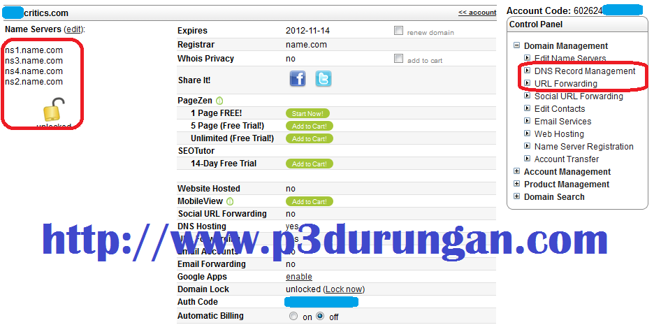 5. Pastikan posisi domain ini sudah tidak terkunci (posisi unlock) dan nameserver pada posisi default (aslinya) yaitu ns1.name.com, ns2.name.com, ns3.name.com dan ns4.name.com